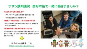 従業員の移動、働き方変更の為に、人員を増員します。 サザン調剤薬局 美好町店で働きたいと思ってくださった方は、まずは話を聞きにくるだけでもいいので、採用ページからお問い合わせください。 採用担当 新井隆史